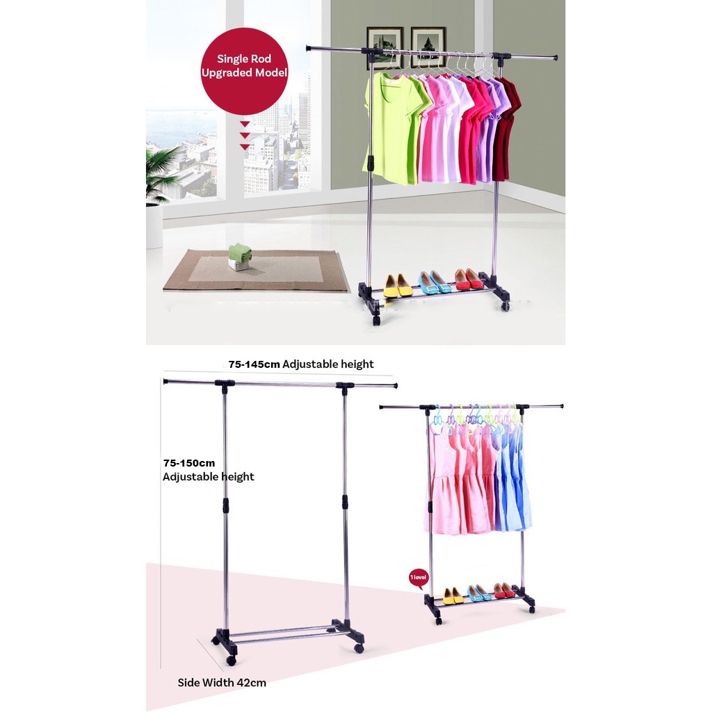 (SG STOCK) Adjustable Single & Double Pole Clothes Rack Stand Drying Rack Clothing Portable Hanging with Wheels