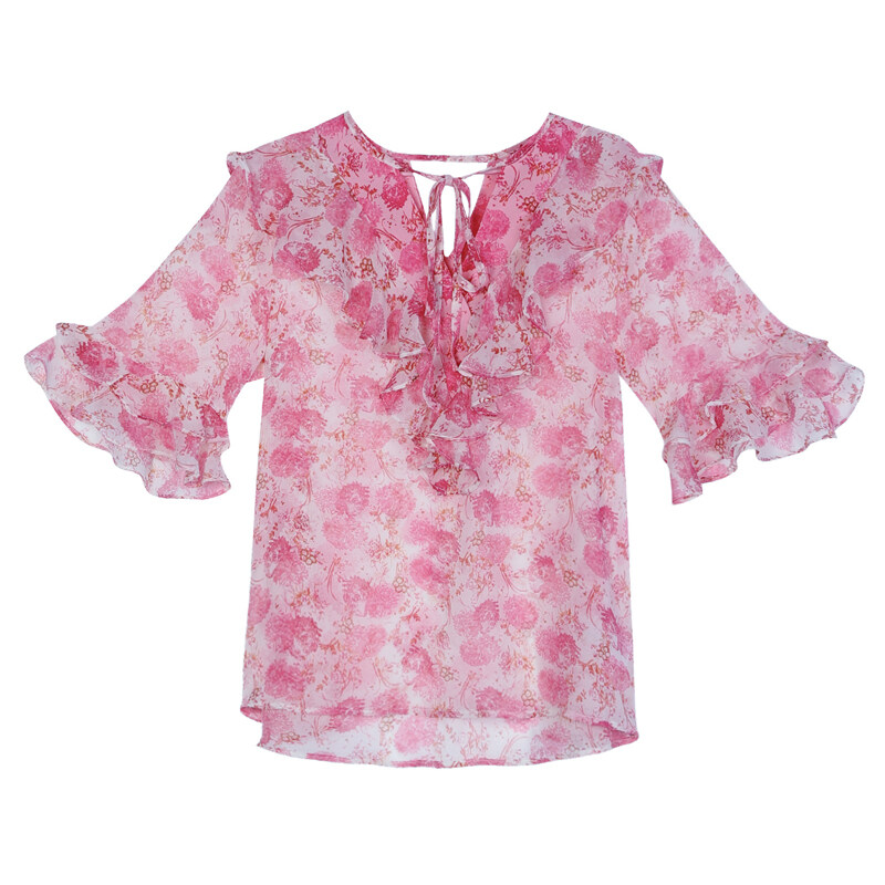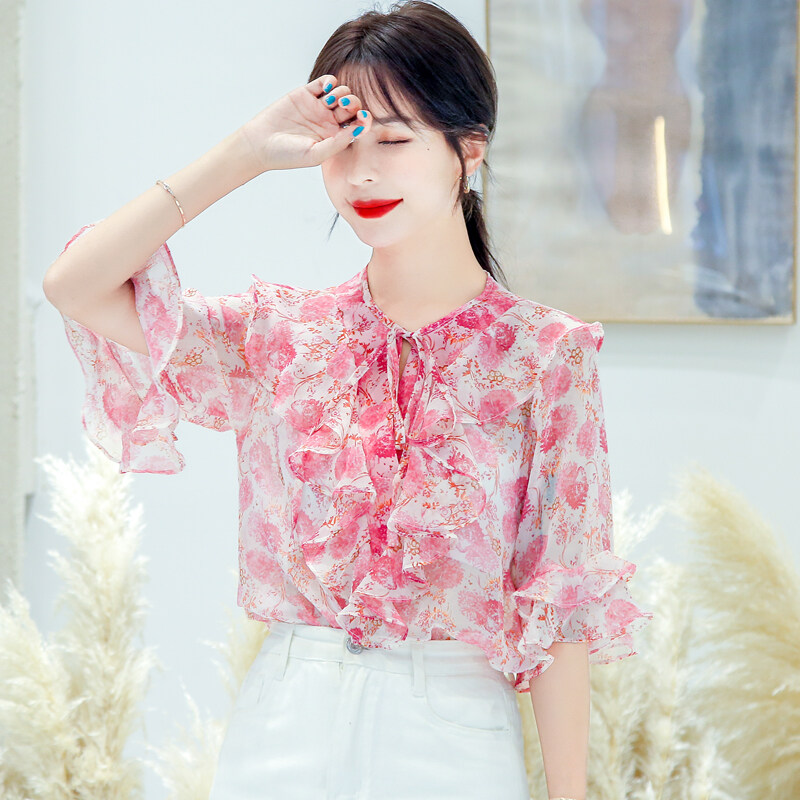 AFEG Korean style women's short-sleeved floral chiffon blouse for women