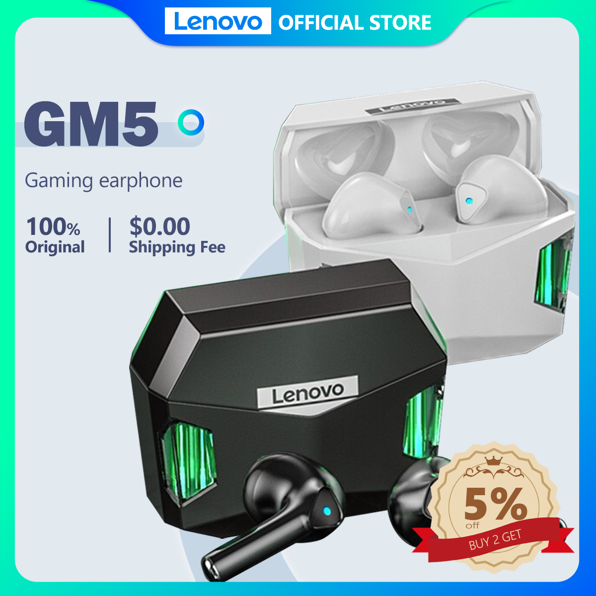 Lenovo GM5 Gaming Low Latency True Wireless Earphone Bluetooth 5.0 Earbuds with HD Stereo Sound with RGB Lights headphone with mic Handfree Earpods earpieces earpod Headset with Microphone audio TWS