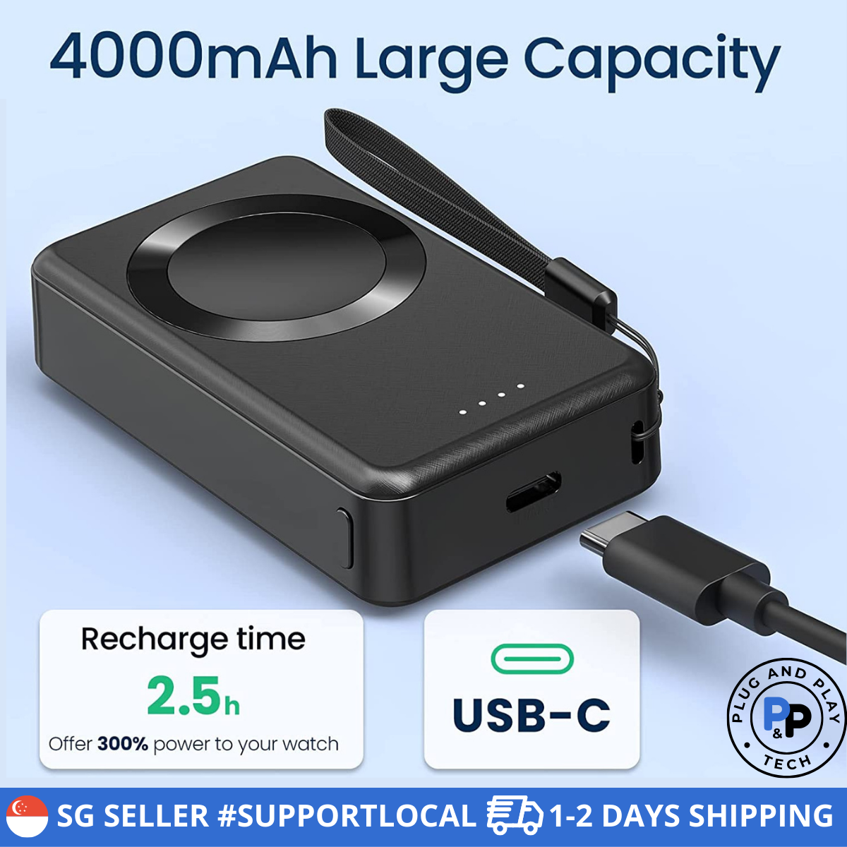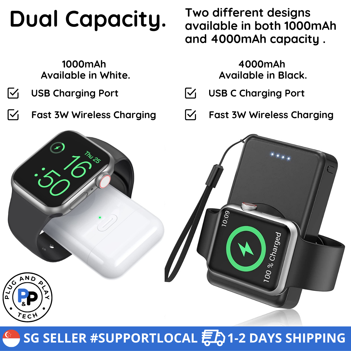 ✅ USB CONNECTIVITY: 1000mAh model comes with a standard USB connector that you can connect to your laptop / charging plug while the 4000mAh model comes with a USB C connector for PD fast charging. Apple Watch and the powerbank can be charged concurrently.