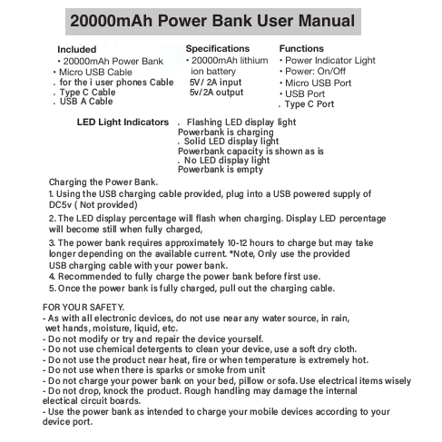 - 20000mAh large capacity, output 2A, estimated to fully charge an iPhone 8 2-3 times.