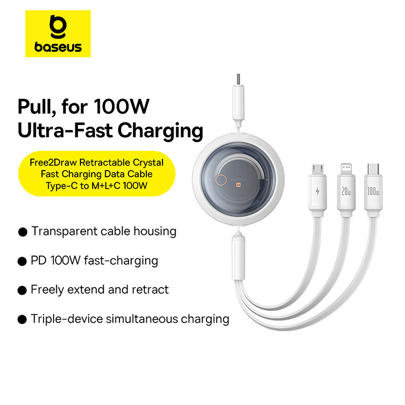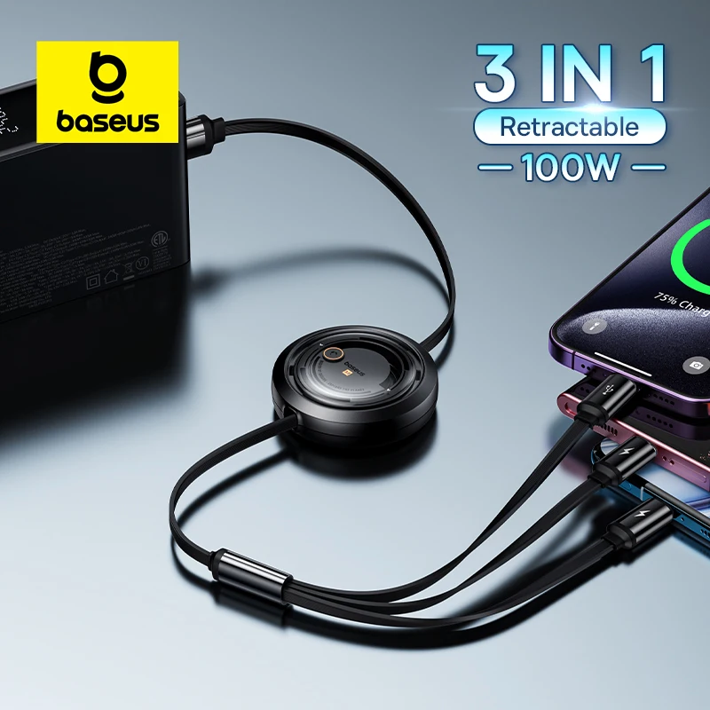 Baseus 100W 3 In 1 Retractable USB Phone Data Cable Type C Fast Charging Cable For iPhone Huawei Xiaomi Android Micro