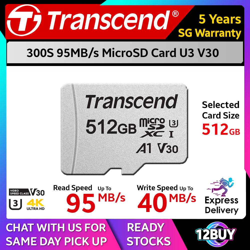Transcend 300S MicroSD Card 95MB/s C10 16GB A1 32GB 64GB U1 128GB 256GB 512GB U3 Express Door Delivery 3 to 7 Days