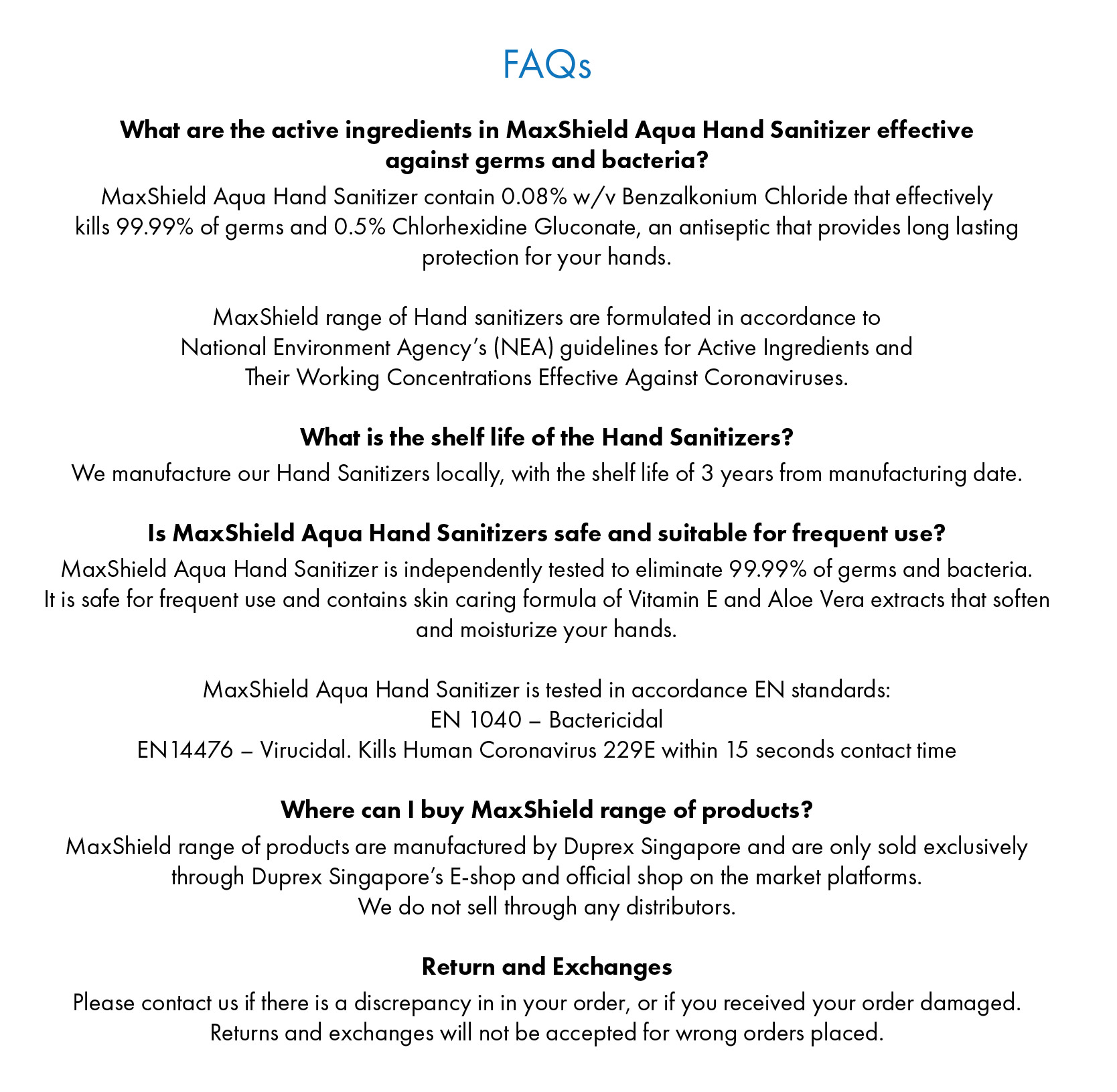 Maxshield Aqua Hand Sanitizer (4 x 60ml) Alcohol Free /Kill 99.99% of germs /Suitable for children/ Made in Singapore